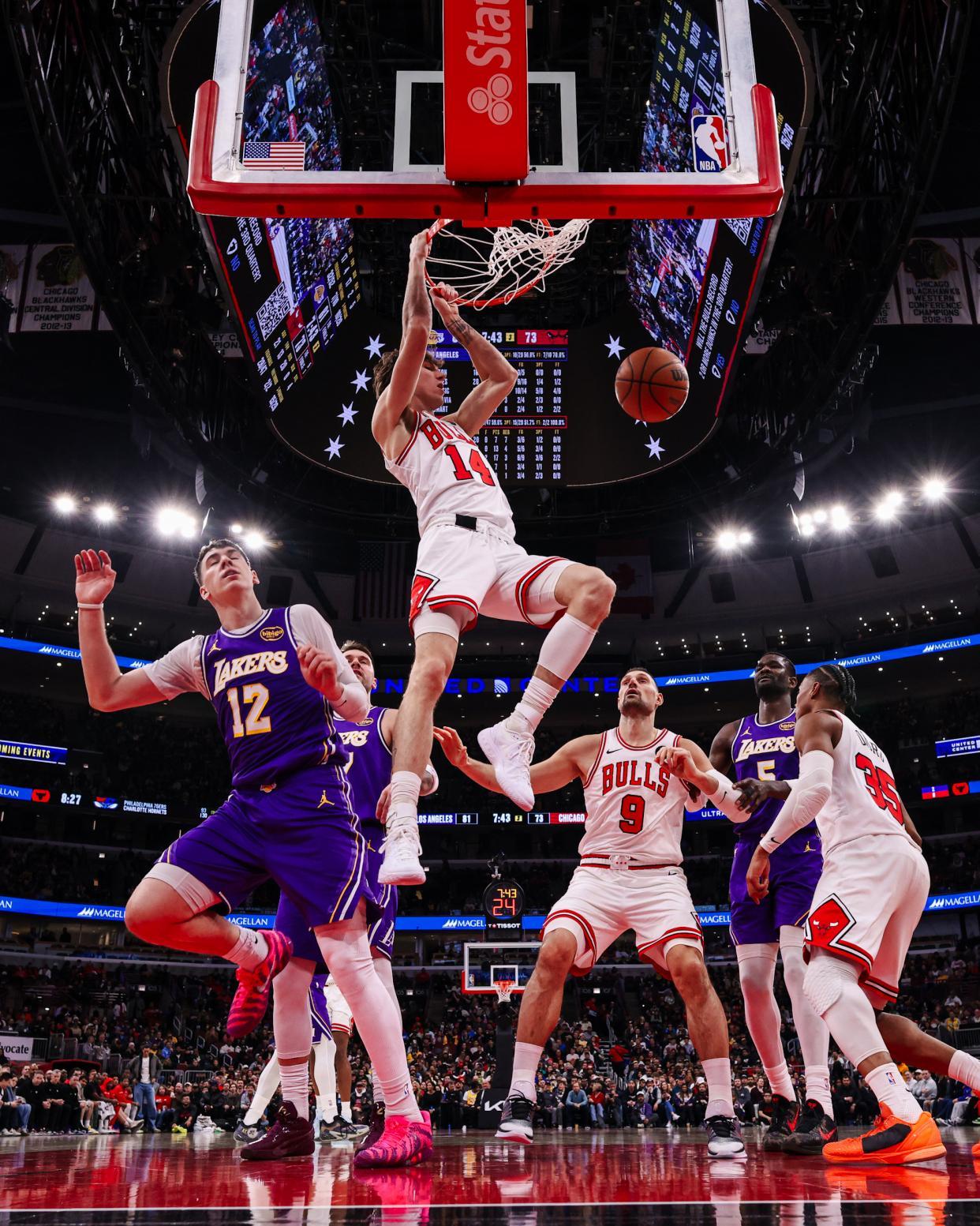 东契奇中投得分,武切维奇补篮打进,詹姆斯连续单打不进,八村塁大帽怀特。道苏姆罚进1球,斯马特2罚全中,芝加哥请求暂停。东契奇轰进三分球,湖人稳住局面,怀特外线取分,雷迪克请求暂停。詹姆斯助攻东契奇轰进远投,海斯抢断吉迪后完成胯下大风车暴扣,湖人领先14分锁定大局。